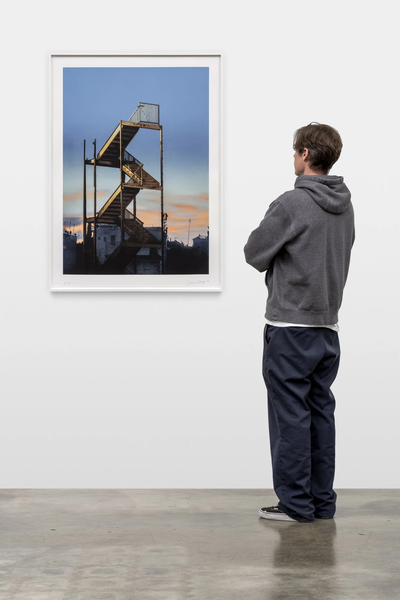For Gomez, the city is a barometer of changing cultural and economic conditions, a deeply layered structure that is ripe for semiotic analysis, whereby it is not so much the structures themselves that are of interest but what they signify and are capable of evoking. From a sculpture, to a painting, to a print, over an 11 year timespan. We currently have another batch of exposed steel staircases straddling the opposite side of the freeway from the now inhabited ‘Da Vinci’ development. Situated on one of the busiest and most congested arteries of the city’s freeway system, we will soon again be delivered a bland approximation of Renaissance class, in an entirely unfitting location; Los Angeles playing itself. Perhaps over time, the allure of European balcony living will give way to the reality of smog-filled walls and patio windows, the incessant noise of commuting vehicles, views of the anonymous glass-walled skyscrapers of banking and commerce, and the misery of the City of Angels’ ever-expanding homeless encampments. Still, the sunsets will never disappoint.